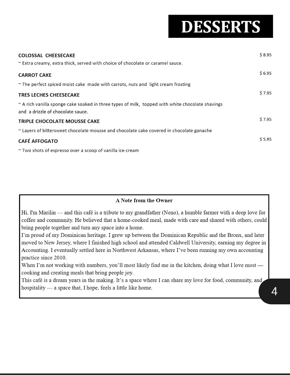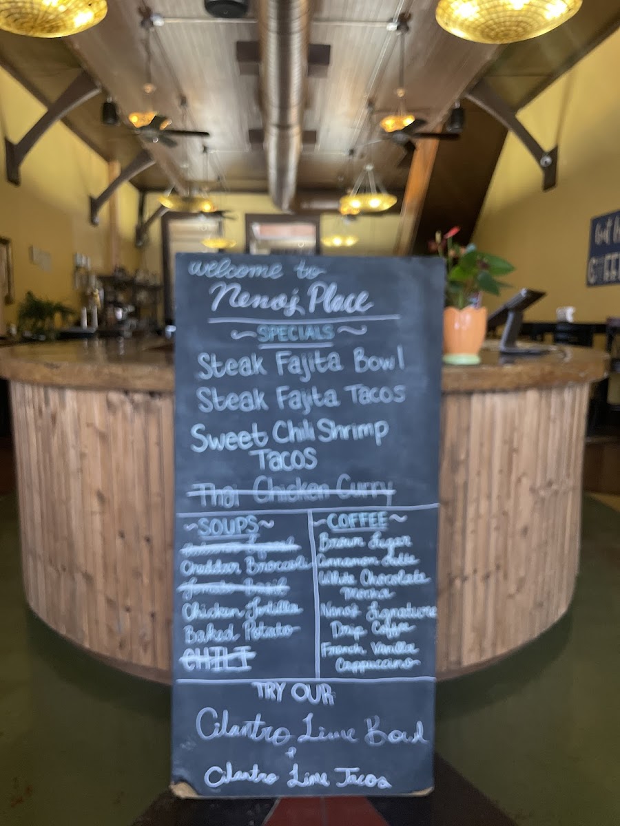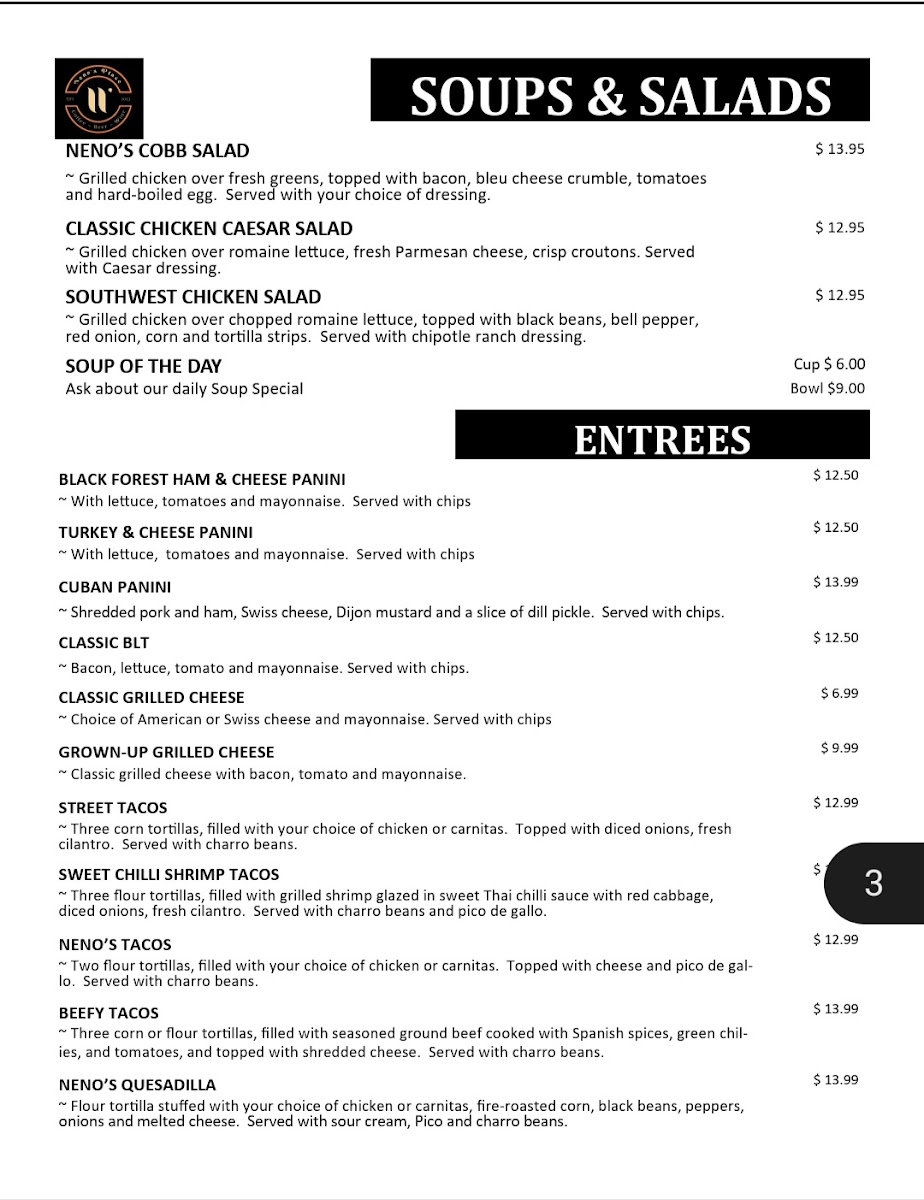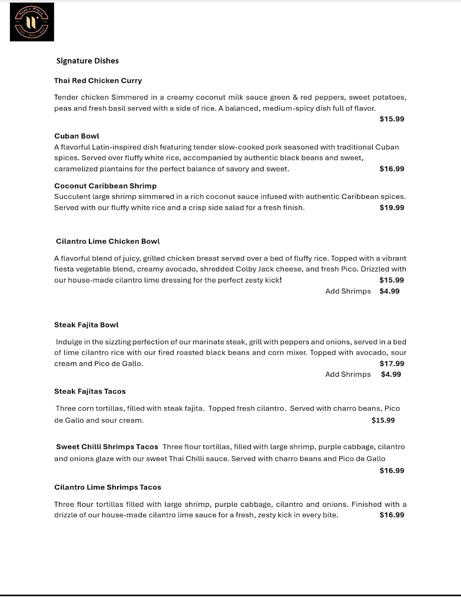 Neno's Place offers a diverse menu that blends flavors from various cuisines, making it a great spot for anyone craving something unique. For signature dishes, you can enjoy the flavorful Thai Red Chicken Curry, the savory Cuban Bowl, or the refreshing Coconut Caribbean Shrimp. There are also hearty options like the Cilantro Lime Chicken Bowl and Steak Fajita Bowl. If you're in the mood for appetizers, try the crispy Breaded Fish Sticks (6) or Chicken Tenders (3), or go for a trio of Salsa & Guacamole. For those wanting something lighter, the Neno's Cobb Salad or Classic Chicken Caesar Salad are great choices, along with the Soup of the Day. Their paninis are a hit, especially the Black Forest Ham & Cheese Panini and Turkey & Cheese Panini. If you're craving something sweet, indulge in the Colossal Cheesecake or the rich Triple Chocolate Mousse Cake. And don’t forget to wash it all down with refreshing beverages like a Roy Rogers or a Montego Bay mocktail, or sip on a perfectly brewed Café Latte or Espresso Shot. With something for every taste, Neno's Place provides an inviting and varied menu that never fails to satisfy.